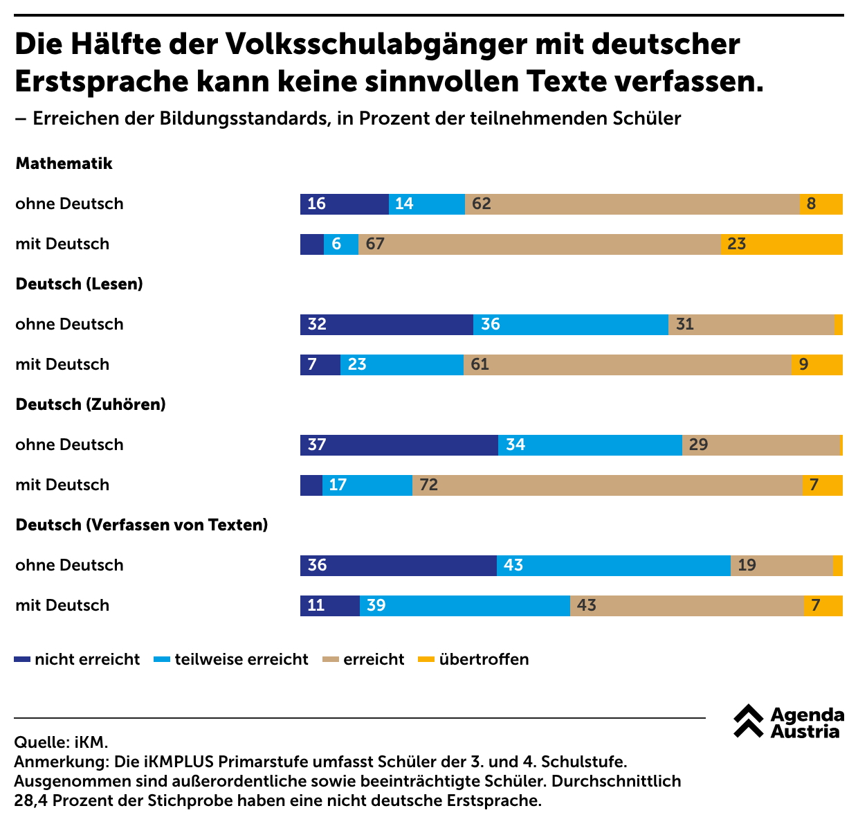 Der Wiener Thinktank Agenda Austria sieht in den Zahlen ein Warnsignal für das Bildungssystem. „Sinnerfassendes Lesen und das Verfassen von deutschen Texten ist und bleibt entscheidend“, unterstreicht er. „Deshalb sollten Sprachdefizite schon vor Schuleintritt erhoben und dementsprechend angegangen werden – unabhängig von der Erstsprache.“