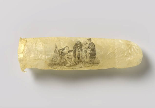 Das Kondom stammte sehr wahrscheinlich aus dem Blinddarm eines Scharfs aus dem 19. Jahrhundert und war das Geschenk eines Bordells. Auf dem Ausstellungsobjekt im Rijksmuseum in Amsterdam befindet sich eine anrüchige Zeichnung: Nonne und drei Priester.