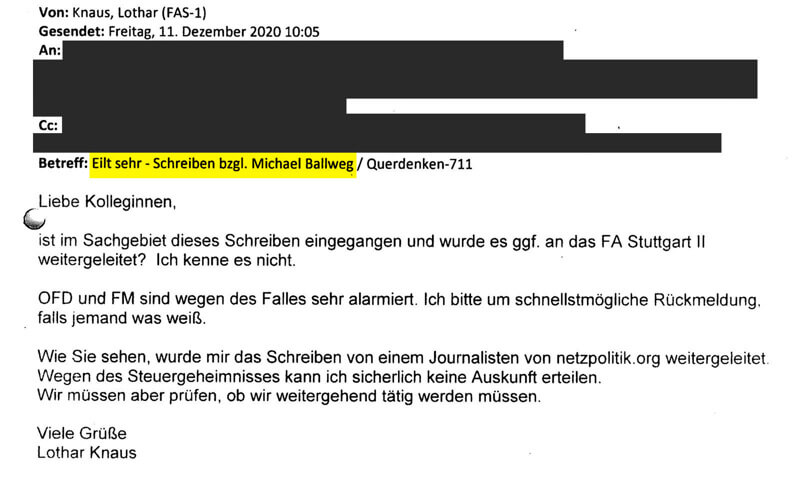 Dieses Schreiben gelangte wenig später auch in die Hände von Jan Böhmermanns Redaktion. Gemeinsam mit einem Journalisten von Netzpolitik.org wurde recherchiert. Am 11. Dezember 2020 erhielt der Leiter des Finanzamts Stuttgart I eine E-Mail des Netzpolitik-Reporters – mit Juns Brief im Anhang. Die Mail machte die runde, aber der Sachverhalt war bis zu diesem Zeitpunkt dem Finanzamt Stuttgart II nicht geläufig.