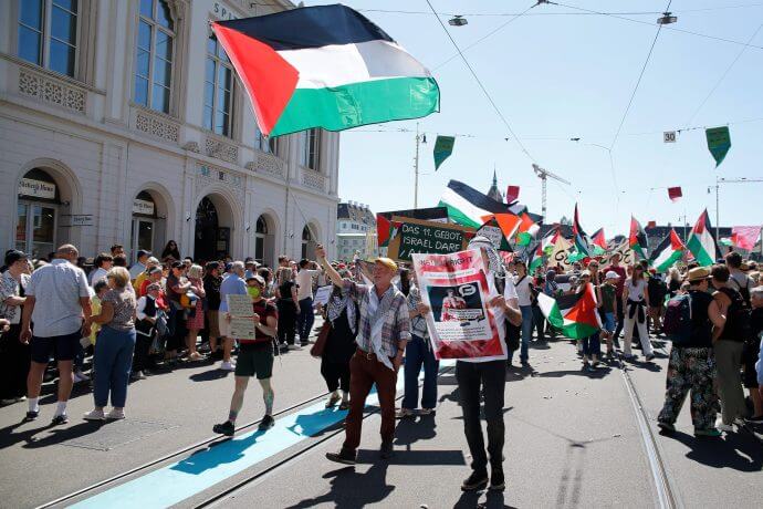 Bereits bei der Eröffnungzeremonie am 11. Mai zogen pro-palästinensische Demonstranten durch Basel.IMAGO/ Manuel Stefan