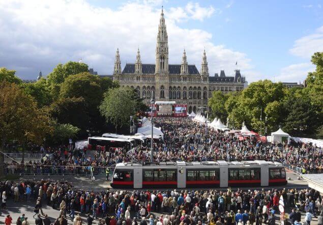 Der Wiener Rathausplatz anlässlich des 150-jährigen Jubiläums der Wiener Straßenbahn im Jahr 2015. An dieser Stelle fand heuer auch die TRAM-WM statt.APA/OTS/Traktionssysteme Austria GmbH/Johannes Zinner