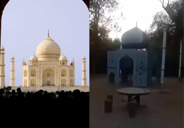 Das indische Mausoleum Taj Mahal (links). Welches Gebäude soll das Spielhaus (rechts) auf einem Spielplatz in Wien-Donaustadt darstellen? IMAGO / Design Pics / Auf1 / Screenshot / exxpress Collage