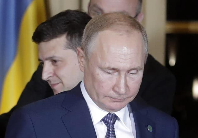 Sie trafen sich Ende 2019 schon einmal in Frankreich: Wolodymyr Selenskyj (Hintergrund) und Wladimir PutinIMAGO/ITAR-TASS