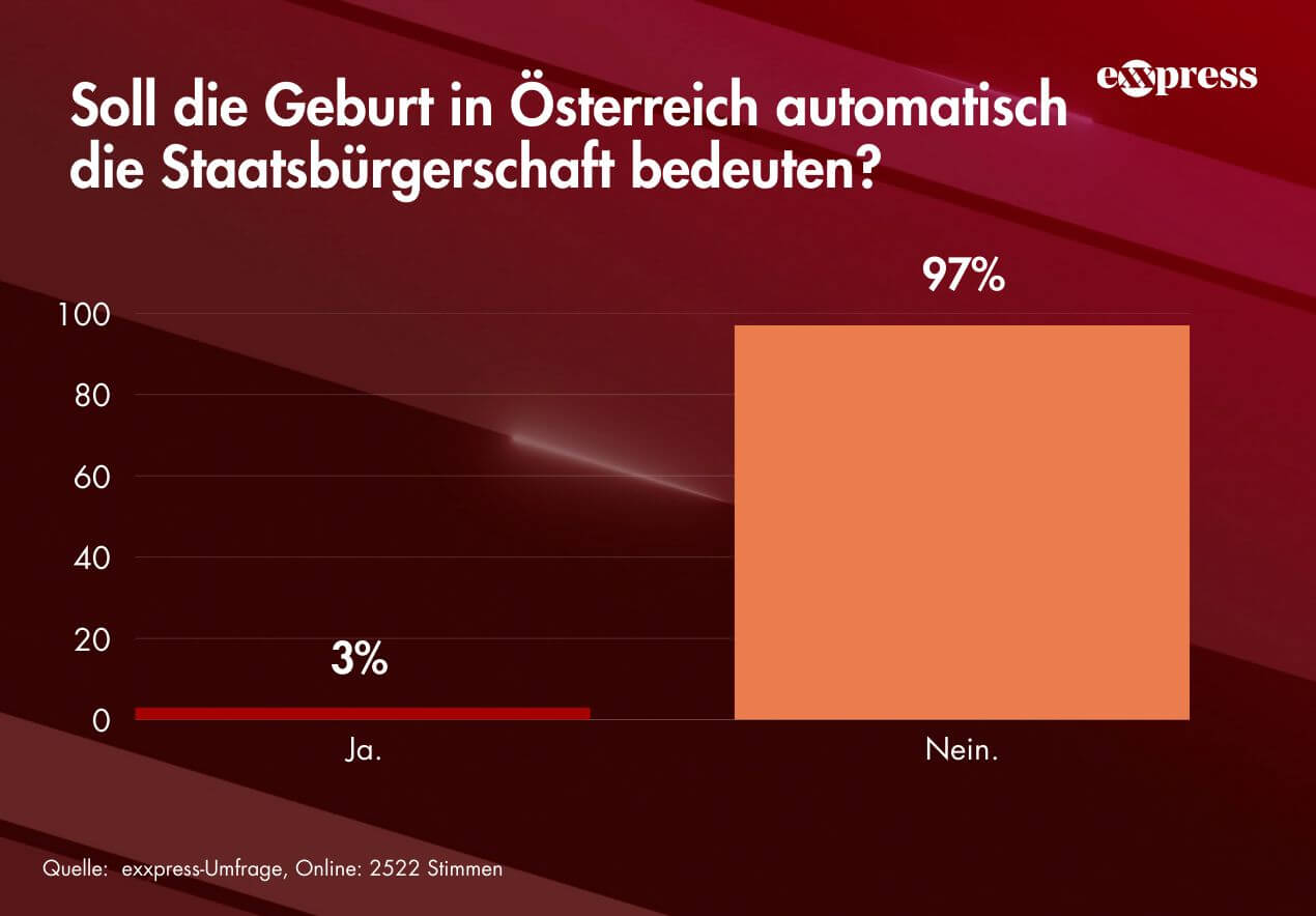 In einer aktuellen Umfrage unter den Zusehern von exxpress Live wurde gefragt, ob die Geburt in Österreich automatisch die Staatsbürgerschaft bedeuten sollte. Das Ergebnis der Befragung zeigt eine klare Ablehnung dieser Idee.
