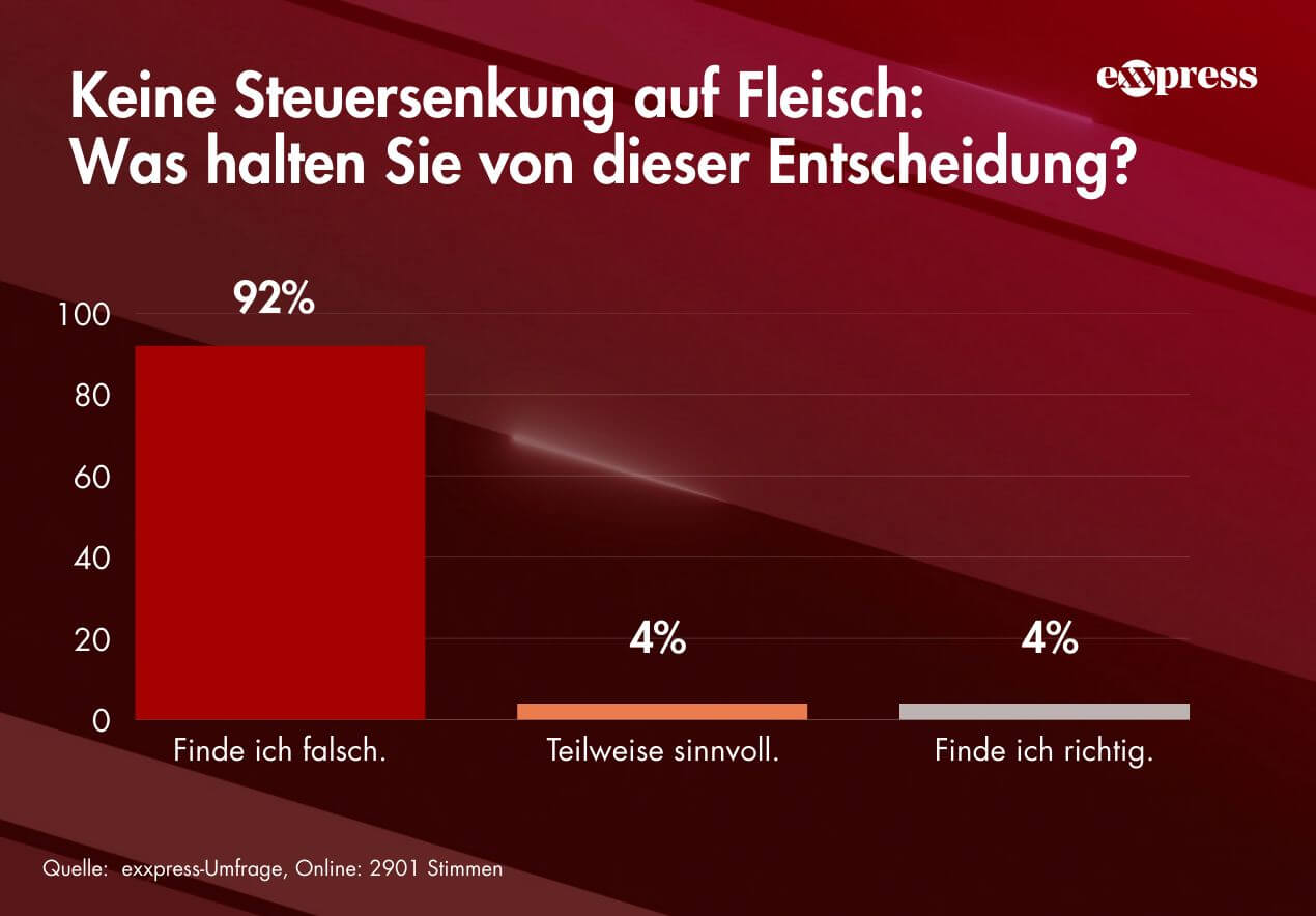Satte 92 Prozent der User sehen die Entscheidung, Fleisch bei der Mehrwertsteuersenkung zu exkludieren, als falsch an, denn Fleisch sei auch ein Grundnahrungsmittel. Der Fokus auf größtenteils pflanzliche Produkte gefällt vier Prozent der Umfrage-Teilnehmenden. Zudem finden weitere vier Prozent die Auswahl „teilweise sinnvoll“.