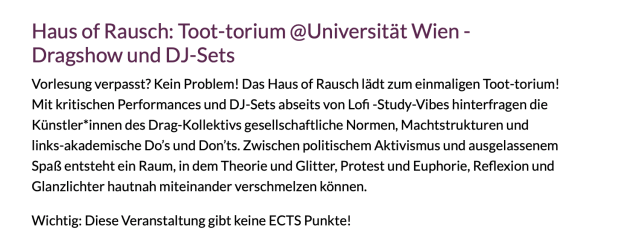 Höhepunkt der ersten Woche ist das „Toot-torium“ des Haus of Rausch – eine Mischung aus Dragshow, DJ-Set und politischem Aktivismus. Laut Einladung sollen dort „Theorie und Glitter, Protest und Euphorie“ miteinander verschmelzen. Eine kleine Einschränkung gibt’s aber: „Diese Veranstaltung gibt keine ECTS-Punkte.“