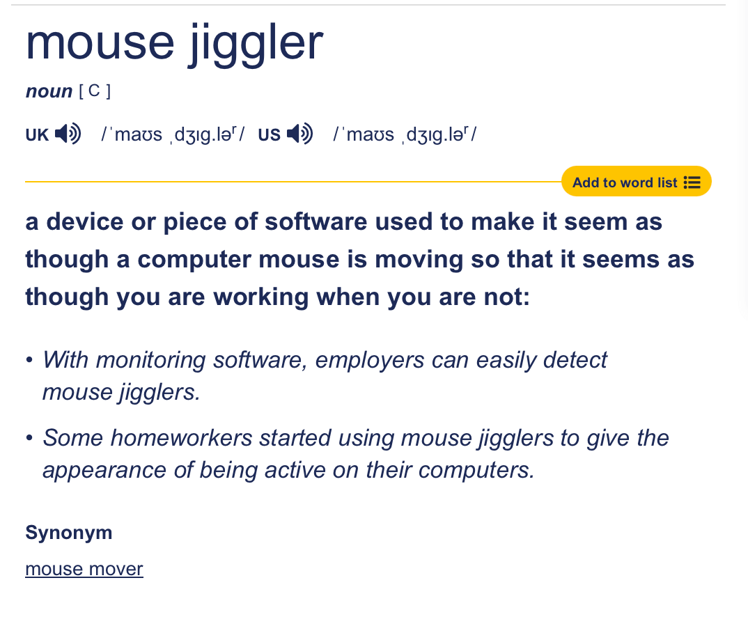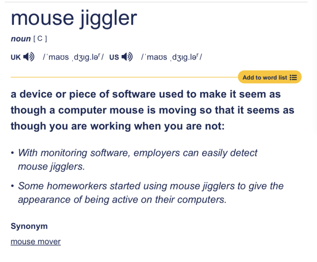 Ebenfalls ins Online-Wörterbuch schaffte es der Begriff “mouse jiggler”. Gemeint ist eine Software, die Mausbewegungen auf dem Computer vortäuscht. Damit kann ein Angestellter im Homeoffice so tun, als würde er arbeiten – obwohl er gar nicht vor dem Bildschirm sitzt. Als Beispielsatz, und gewissermaßen als Warnung, fügt das Cambridge Dictionary hinzu, dass Arbeitgeber diesen Trick ziemlich leicht aufdecken können.