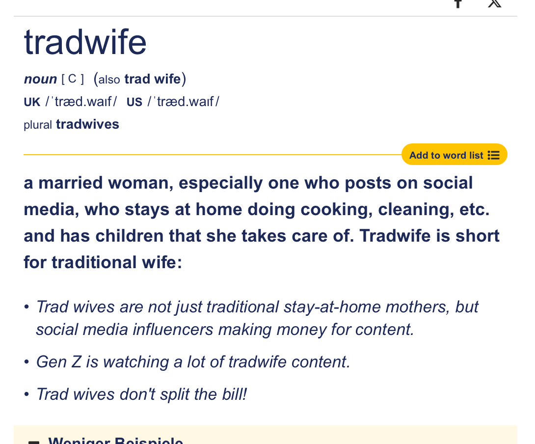 Das aus den englischen Wörter für traditionell und Ehefrau (traditional und wife) zusammengesetzt Schachtelwort “tradwife” stehe für einen “wachsenden und umstrittenen Trend auf Instagram und Tiktok, der traditionelle Geschlechtsrollen begrüßt”. Bei dem “tradwife”-Trend stellen sich Frauen in traditionellen Rollen als Ehefrau und Mutter dar, die Erfüllung im Haushalt, beim Kochen, Putzen und Aufziehen der Kinder finden.