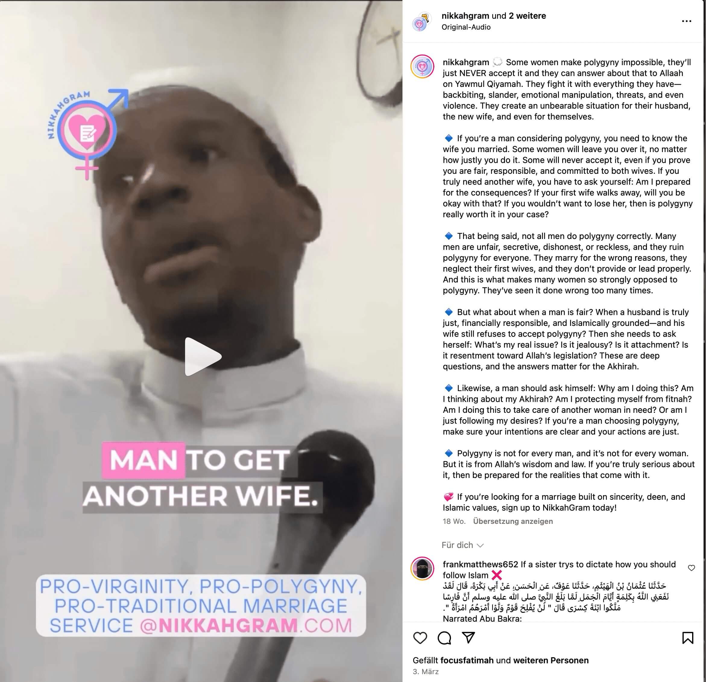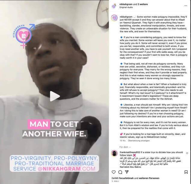 Das klingt wie aus dem Mittelalter – ist aber real, online, und laut eigenen Angaben in London beheimatet. Männer zahlen zwischen 29 und 585 Euro, um Zugang zu Frauenprofilen zu erhalten. Jungfräuliche Frauen unter 35, Witwen, Waisen und Schwestern mit starker Behinderung, die offen für die Polygamie sind, dürfen sich kostenlos anmelden. Für sie ist NikkahGram offenbar nicht nur Plattform, sondern auch Ideologie: Sie sollen ihre Rolle als Hausfrau akzeptieren – so wie Männer ihre als „Ernährer“ zu respektieren hätten.