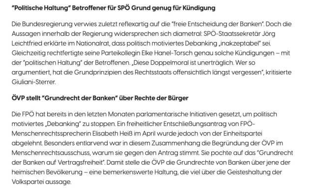 Im April 2025 befasste sich der Nationalrat mit einem selbständigen Entschließungsantrag der FPÖ, der auf ein Verbot politisch motivierter Kontokündigungen abzielte. Mit dem Antrag wollte die FPÖ die Bundesregierung auffordern, rechtliche Maßnahmen zu prüfen, um sicherzustellen, dass Bankkonten nicht allein aufgrund politischer oder weltanschaulicher Gründe beendet oder verweigert werden können. Der Antrag wurde nach Debatte im Plenum abgelehnt.