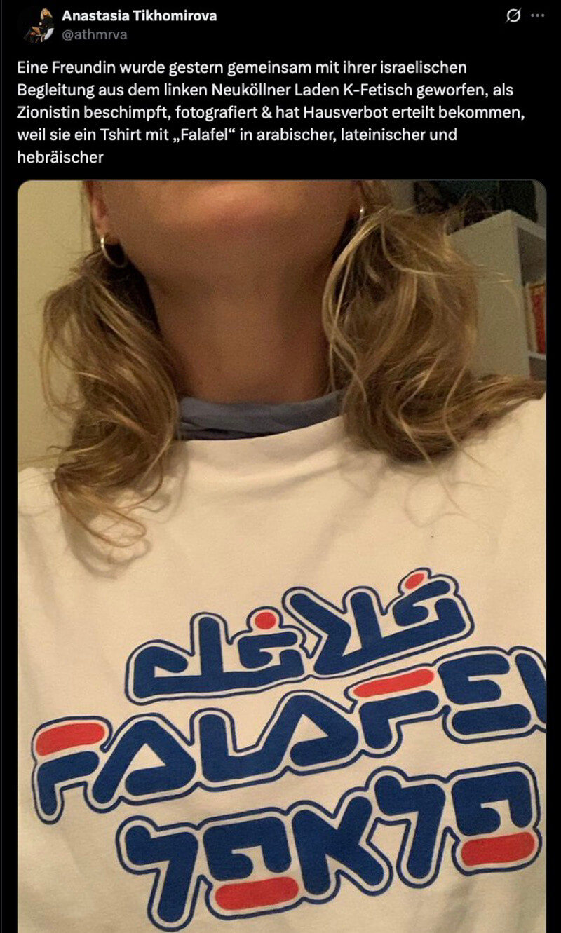 Der Vortrag von Anfang Oktober ist aber auch deshalb brisant, weil das k-Fetisch erst vor wenigen Tagen in die Schlagzeilen geriet: Eine Frau mit T-Shirt, auf dem das Wort „Falafel“ auf Arabisch, Englisch und Hebräisch prangte, wurde von einer Mitarbeiterin des Cafés als „Zionistin“ beschimpft und rausgeworfen. „Ich bediene keine Zionisten“ und „Hebräisch ist die Sprache des Unterdrückers“, soll die Bedienung gerufen haben.