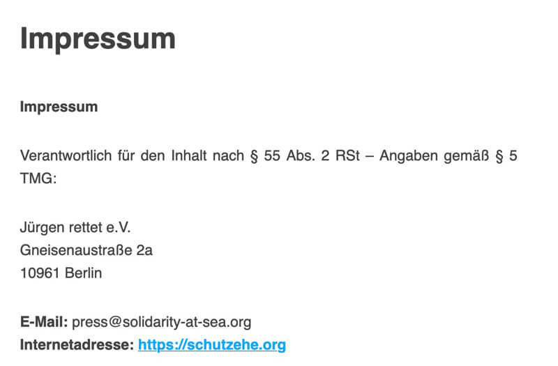 Schutzehe-Impressum fast deckungsgleich mit Seenotrettungs-NGOs