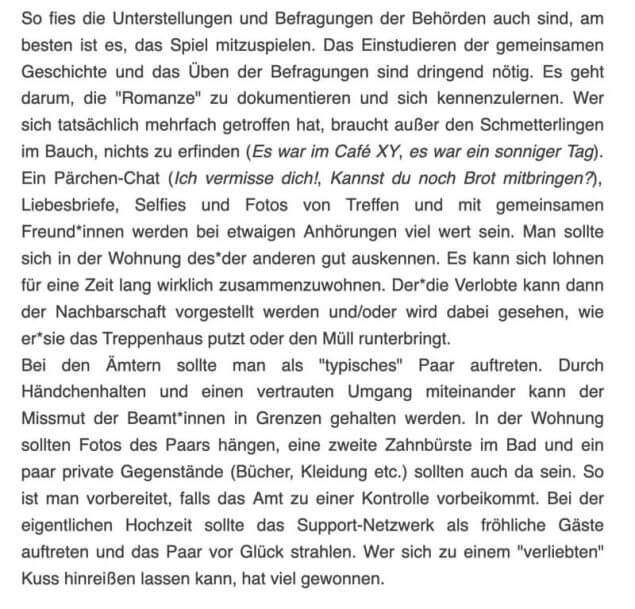 Auch die bei dem Vortrag beworbene Website erscheint beachtenswert: Auf www.schutzehe.org liefern Autoren praktische Tipps für die Verhinderung von Abschiebungen mittels Scheinehen: Paare sollen eine „Geschichte“ ihrer Beziehung erfinden, heißt es, diese mit gefälschten Chats, Selfies sowie Liebesbriefen belegen, die Wohnung des Partners mit privaten Utensilien wie einer zweiten Zahnbürste „authentisch“ herrichten und bei Befragungen intime Details wie Parfum oder Rasurmethoden synchronisieren – um Behörden gezielt zu täuschen. „Lügen sind notwendig, weil der Staat die Ehe instrumentalisiert“, heißt es auf schutzehe.org.