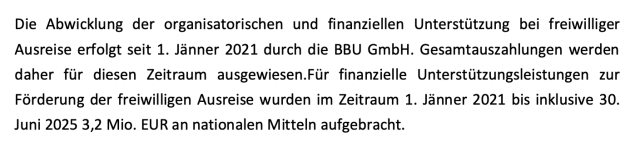 Im Zeitraum vom 1. Januar 2021 bis zum 30. Juni 2025 wurden insgesamt 3,2 Millionen Euro für die Rückkehrhilfe aus nationalen Mitteln aufgebracht. In der parlamentarischen Anfrage des Abgeordneten Mag. Norbert Nemeth (FPÖ) vom 9. Juli 2025 an Innenminister Karner wurden diese Zahlen bestätigt. Laut Karner ist die freiwillige Rückkehr eine “kostengünstigere” und “nachhaltigere Lösung” im Vergleich zu Zwangsabschiebungen.