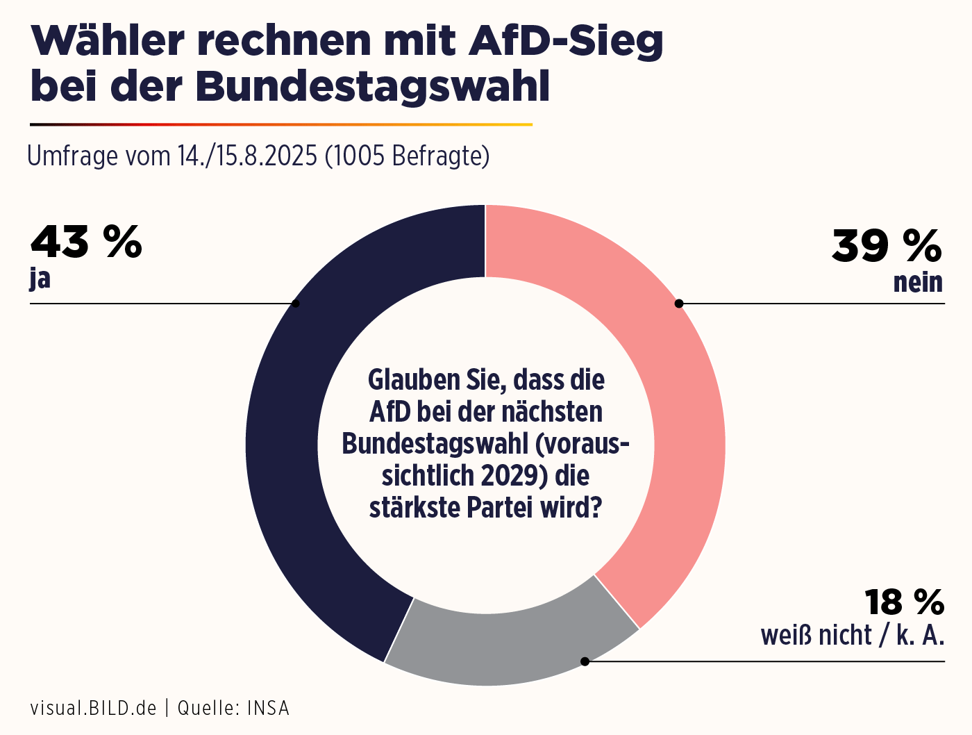 Auch auf Bundesebene wächst die Erwartung: 43 Prozent der Befragten trauen der AfD bei der nächsten Bundestagswahl (voraussichtlich 2029) zu, stärkste Kraft zu werden. 39 Prozent halten das hingegen für ausgeschlossen.