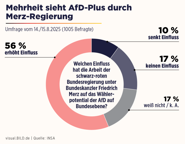 Besonders brisant: Die Arbeit der schwarz-roten Bundesregierung unter Friedrich Merz scheint die AfD weiter zu stärken. Mehr als die Hälfte der Deutschen (56 Prozent) glaubt, dass die Politik der Regierung das Wählerpotenzial der AfD vergrößert. Nur 10 Prozent erwarten das Gegenteil.