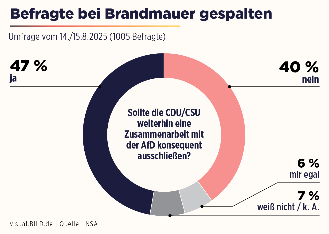Trotzdem bleibt die Frage nach möglichen Koalitionen offen. Die Hälfte der Befragten unterstützen eine harte Brandmauer und wollen, dass die Union unter keinen Umständen mit der AfD zusammenarbeitet. Gleichzeitig fordern 40 Prozent bereits, dieses Tabu endlich zu beenden.
