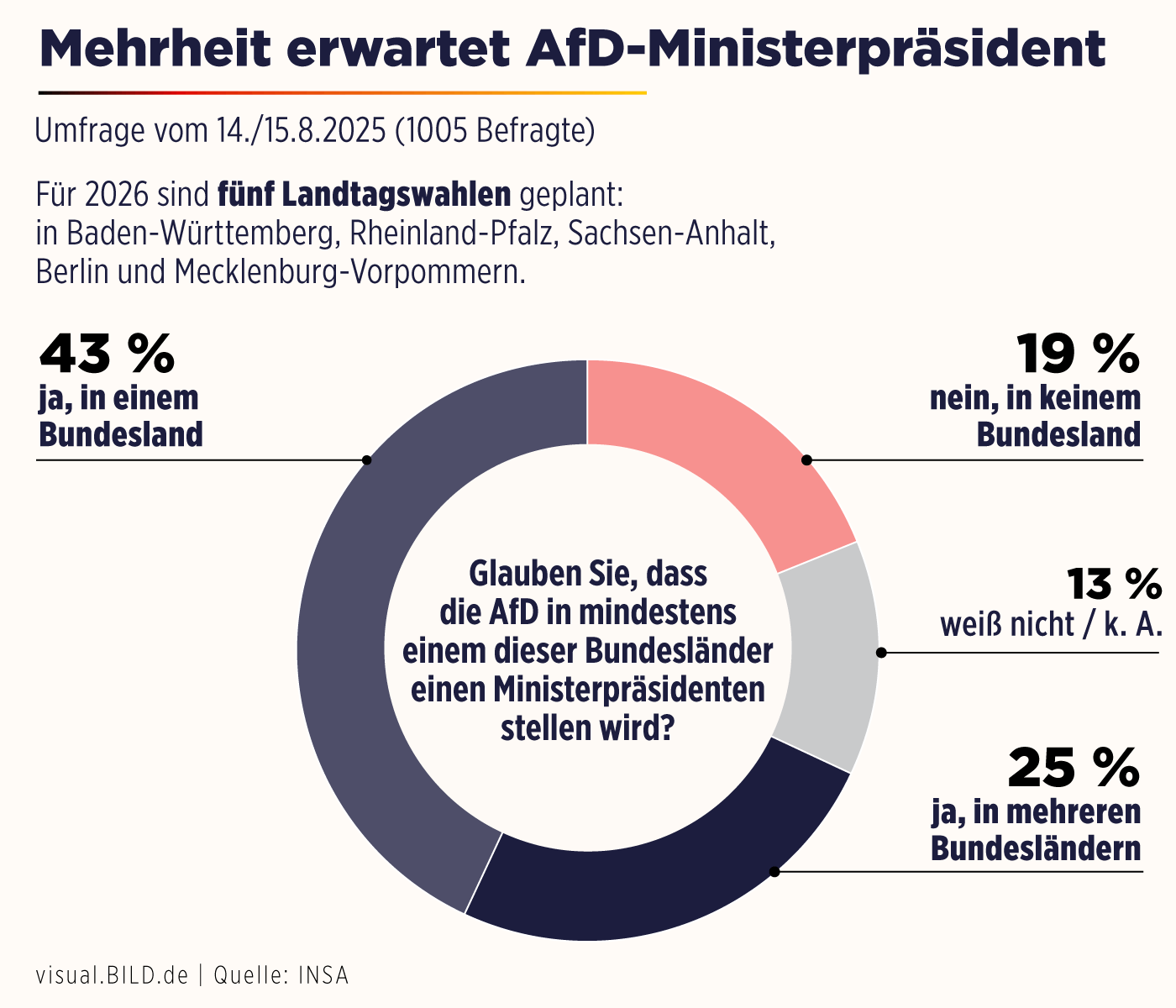 Die Stimmung im Land kippt. Bei den kommenden Landtagswahlen im Jahr 2026 in Baden-Württemberg, Rheinland-Pfalz, Sachsen-Anhalt, Berlin und Mecklenburg-Vorpommern könnte die AfD nach Meinung vieler Bürger den nächsten großen Schritt machen. Ganze 68 Prozent der Befragten sind überzeugt, dass die Partei mindestens einen Ministerpräsidenten stellen wird. Jeder vierte Deutsche glaubt sogar, dass gleich in mehreren Ländern ein AfD-Landeschef ins Amt kommt.