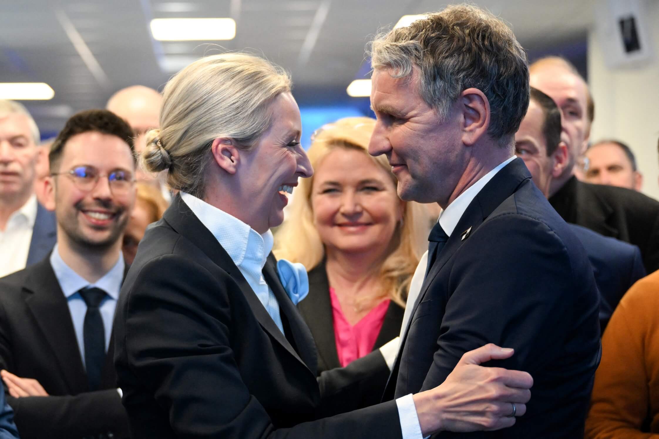 Kanzlerkandidatin und Co-Vorsitzende der AfD Alice Weidel und der Landesvorsitzende in Thüringen Björn Höcke (r.) umarmen sich am Wahlabend in Berlin.APA/AFP/POOL/Soeren STACHE