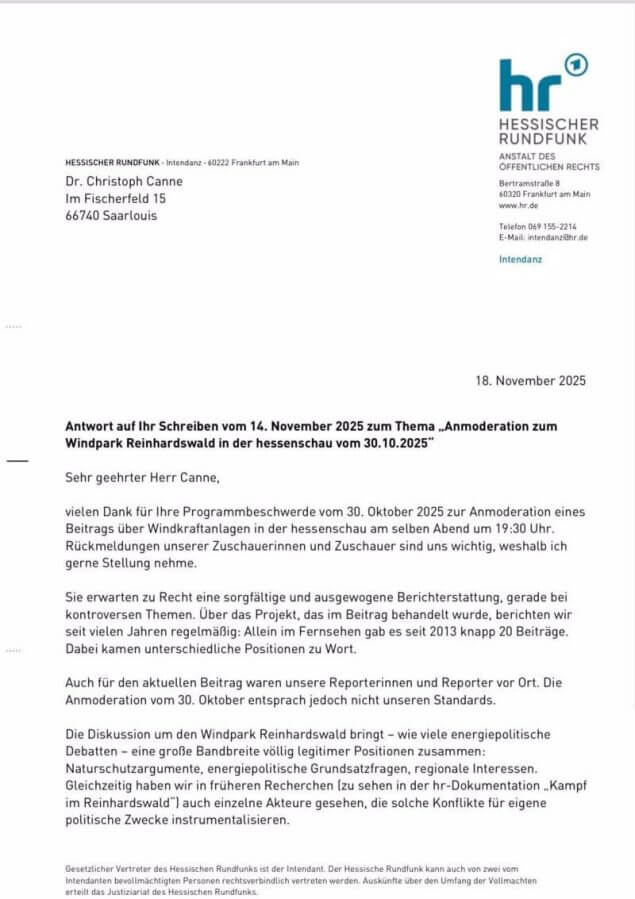 Dr. Christoph Canne von Vernunftkraft, dem Dachverband für Bürgerinitiativen gegen Windkraft und die Energiewende, kritisierte die Entgleisung auf X scharf: „Journalistische Neutralität ist das Fundament des öffentlich-rechtlichen Rundfunks. Die hessenschau hat mit dieser Anmoderation diese Grenze weit überschritten – indem legitime Naturschützer und Kommunalpolitiker pauschal mit Querdenkern und Rechtsextremen gleichgesetzt wurden.“