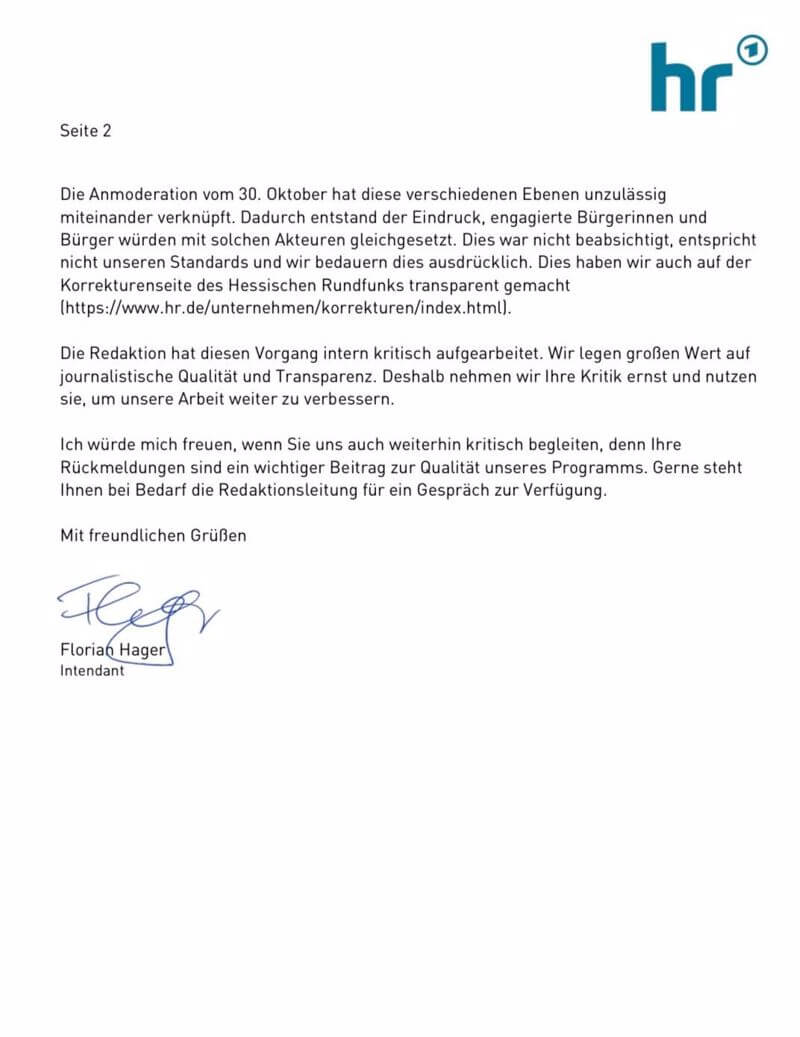 Intendant Florian Hager antwortete auf Cannes Beschwerde in einem offiziellen Schreiben, macht darin Zugeständnisse: Die Anmoderation habe die verschiedenen Perspektiven der Debatte „unzulässig miteinander verknüpft.“ Hager weiter: „Dadurch entstand der Eindruck, engagierte Bürgerinnen und Bürger würden mit solchen Akteuren gleichgesetzt. Dies war nicht beabsichtigt, entspricht nicht unseren Standards, und wir bedauern dies ausdrücklich.“ Man habe das auch auf der Korrekturenseite der Hessischen Rundfunks transparent gemacht.