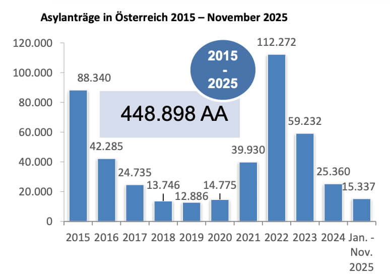 Bis November 2025 wurden in Österreich 15.337 Asylanträge gestellt. Da die Dezember-Zahlen noch fehlen, ist eine konservative Hochrechnung auf rund 16.000 bis 16.500 Anträge für das Gesamtjahr realistisch. Das wäre ein Rückgang um rund 35 Prozent gegenüber 2024 (25.360 Asylanträge).