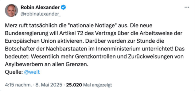Nach Informationen der Tageszeitung Welt wird Friedrich Merz demnächst eine „nationale Notlage“ ausrufen. Damit will die neue Bundesregierung den Weg freimachen für nationale Grenzkontrollen und Zurückweisungen gegen die illegale Massenmigration.