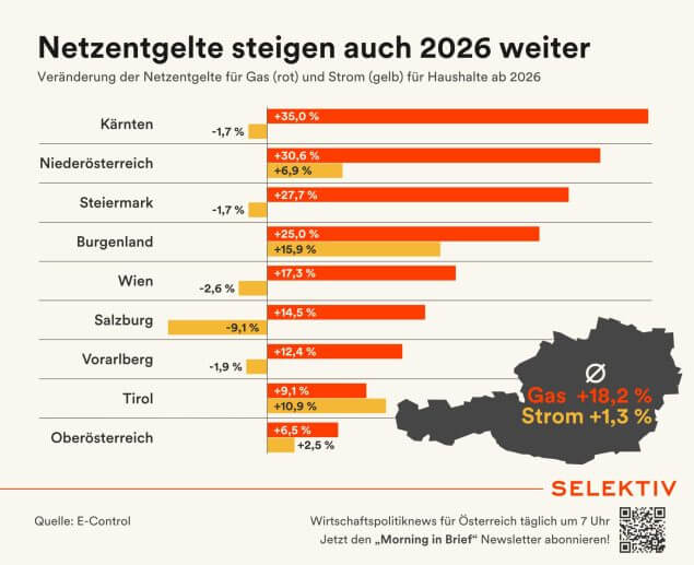 Österreichs Energiepolitik steuert auf ein widersprüchliches Jahr 2026 zu. Während die Regierung das Billigstromgesetz als größte Strommarkt-Reform seit zwei Jahrzehnten feiert – ganz unter dem Motto „Stromkosten runter, Laune rauf“ – zeigen neue Zahlen ein anderes Bild: Die Netzentgelte für Gas steigen ab 1. Jänner im Schnitt um 18,2 Prozent, seit 2024 ergibt sich laut Analysen sogar eine durchschnittliche Mehrbelastung von 38 Prozent. Besonders stark betroffen sind einzelne Bundesländer, wo die Erhöhungen deutlich über dem Schnitt liegen.