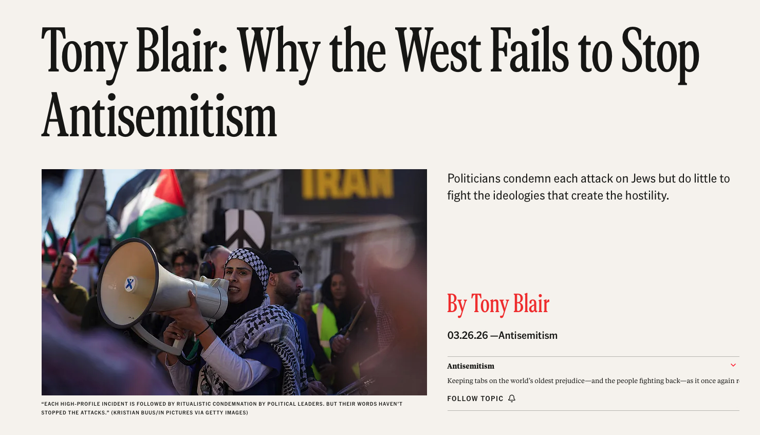 Doch statt konsequent zu handeln, bleibe es bei Symbolpolitik. Nach jedem Angriff folge eine „ritualisierte Verurteilung“, kritisiert Blair in seinem Beitrag für The Free Press – ohne jede Wirkung.