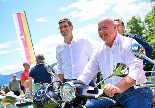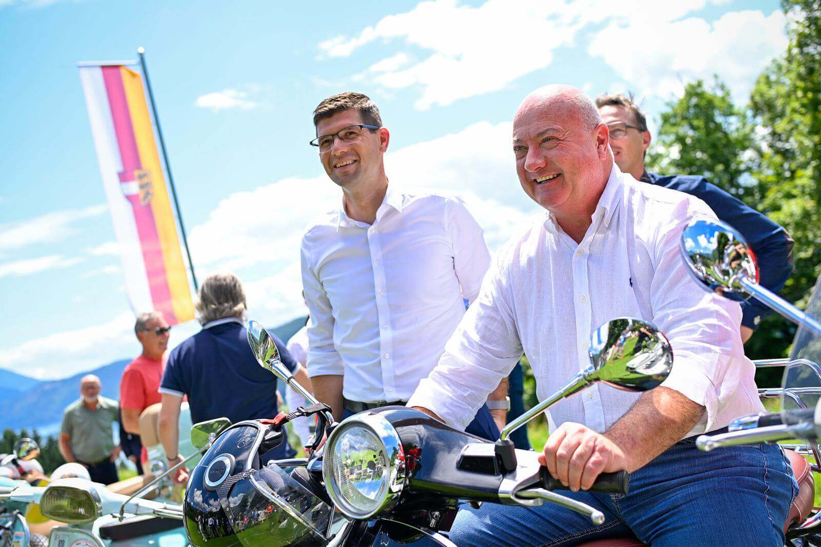 Spritztour mit der Vespa: Bundeskanzler Christian Stocker (ÖVP, r.) genoss mit dem Kärntner Landeshauptmann-Stellvertreter Martin Gruber (ÖVP, l.) die kurze Ausfahrt.Kärntner Volkspartei/Helge Bauer