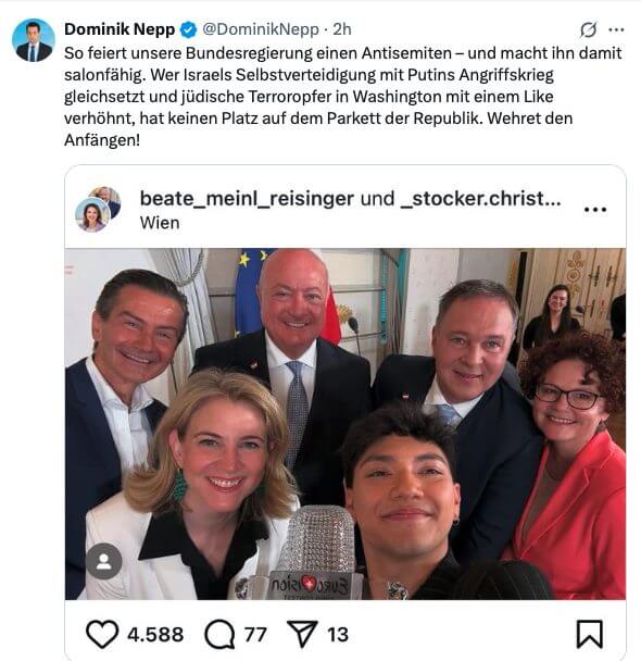 Der Wiener Landesparteiobmann der FPÖ Dominik Nepp postete auf X ein Foto von JJ in fröhlicher Runde mit ORF-Chef Roland Weißmann, Bundeskanzler Christian Stocker, Vizekanzler Andreas Gabler, Außenministerin Beate Meinl-Reisinger und Staatssekretärin Elisabeth Zehetner und schreibt dazu: „So feiert unsere Bundesregierung einen Antisemiten – und macht ihn damit salonfähig.”