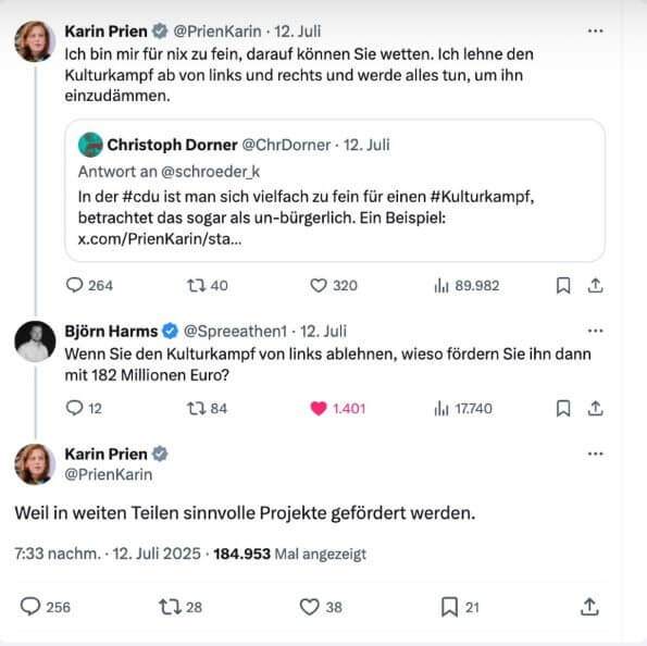 Doch statt „Links ist vorbei!“ gilt unter der Familienministerin Karin Prien: Links kriegt ab jetzt noch üppigere Förderungen! Bereits im Juli positionierte sich die Unions-Politikerin auf der Plattform X klar pro „Demokratie leben!“. Björn Harms, stellvertretender Chefredakteur von NIUS und Autor des Bestsellers „Der NGO-Komplex“, fragte damals die Ministerin auf X: „Wenn Sie den Kulturkampf von links ablehnen, wieso fördern Sie ihn dann mit 182 Millionen Euro?“ Prien antwortete: „Weil in weiten Teilen sinnvolle Projekte gefördert werden.“