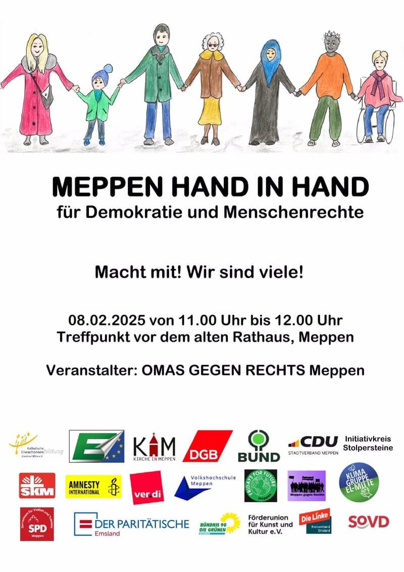 Zur Menschenkette der „Omas gegen Rechts“ rufen unter anderem die SPD, die Grünen, die Linke, Fridays for Future, die Gewerkschaft Verdi, der BUND, das Bündnis „Meppen gegen Rechts“ und die Kirche auf. Treffen will man sich um 11 Uhr vor dem alten Rathaus in Meppen.