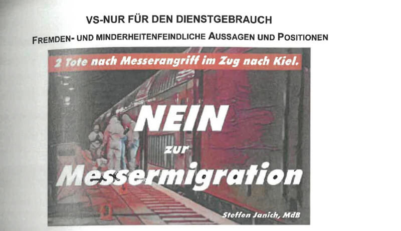 Auch die Nutzung des Begriffs „Messermigration“ wird der AfD zur Last gelegt. So heißt es im Gutachten: „Die AfD beziehungsweise ihre Funktionärinnen und Funktionäre bringen in ihren Aussagen zu dem fortgesetzt und verallgemeinernd Personen mit Migrationsgeschichte mit dem in abfälliger Weise verwendeten Präfix ‚Messer‘ in Verbindung. Seit der Verdachtsfall-Einstufung ist weiterhin eine hohe Frequenz von entsprechenden Beiträgen zu verzeichnen. Das in den nachfolgend dargestellten Aussagen verwendete Kompositum ‚Messermigration‘ stellt in herabwürdigender Weise eine direkte Korrelation zwischen Migrationsprozessen und der Zunahme von Straftaten mit Stichwaffen her. Bei einem systematischen Sprachgebrauch in diesem Sinne ist die Schwelle hin zu einer die Menschenwürde verletzenden Pauschalisierung überschritten, da die Äußerungen in ihrer Zielsetzung kontinuierlich herabsetzen und entwürdigend sind.“