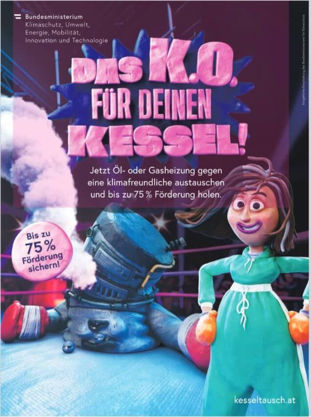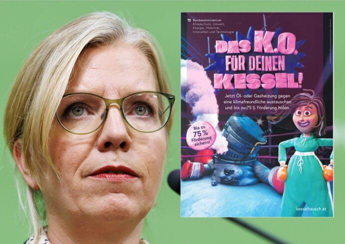 Unter dem Titel „Heizkesselkampagne“ ließ Gewessler unter ihrer Ministerverantwortlichkeit mehrere Inserate sowie TV-Werbung schalten – das kostete den Steuerzahler insgesamt mehrere Millionen Euro. Allein ein einziges Zeitungsinserat, das über die Medientransparenz-Datenbank abgerufen werden kann (Screenshot siehe unten), wurde mit einem Werbevolumen von über einer Millionen Euro inseriert. Man sieht auf dem Inserat den Spruch „Das K.O. für deinen Kessel!“, verbunden mit einer Cartoon-ähnlichen Darstellung eines kaputten Heizkessels samt Hinweis auf eine Förderung.