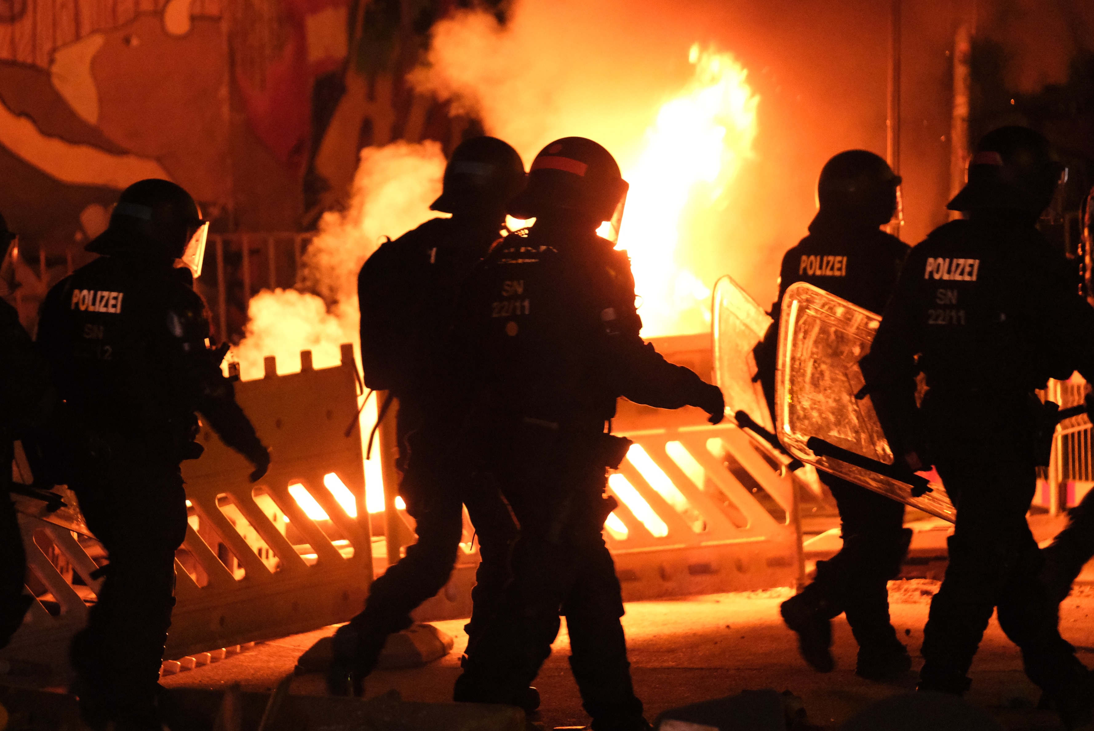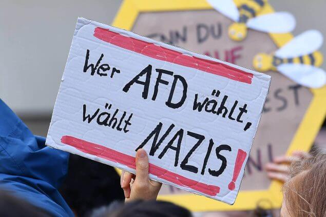 Antifa-Demo gegen AfD-Chefin Alice Weidel – linke Aktivisten blockieren Wahlkampfveranstaltung bei Frankfurt.APA/AFP/Kirill KUDRYAVTSEV