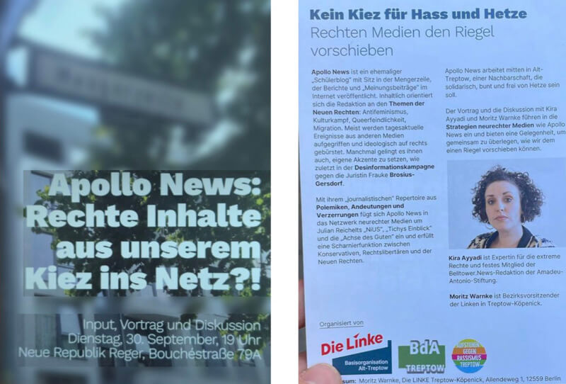 Das Geld wurde neben den Projekten auch in ein eigenes Medienprojekt investiert: Belltower News. Dort schreibt auch die „Expertin für die extreme Rechte“, Kira Ayyadi. Sie sprach gemeinsam mit dem Bezirksvorsitzenden der Linken Treptow-Köpenick bei einem gemeinsamen Treffen des „Bund der Antifaschisten Treptow e.V.“ und der Partei Die Linke unter dem Motto „Apollo News: Die rechte Redaktion in unserem Kiez“. Auf einem Flyer, der auf der Veranstaltung verteilt wurde, hieß es, man wollte „rechten Medien“ wie Apollo News „auf die Tasten treten“ und „gemeinsam Alt-Treptow für Apollo News ungemütlich machen“. Außerdem wollte man rechtes Gedankengut „aus den Köpfen treiben“.