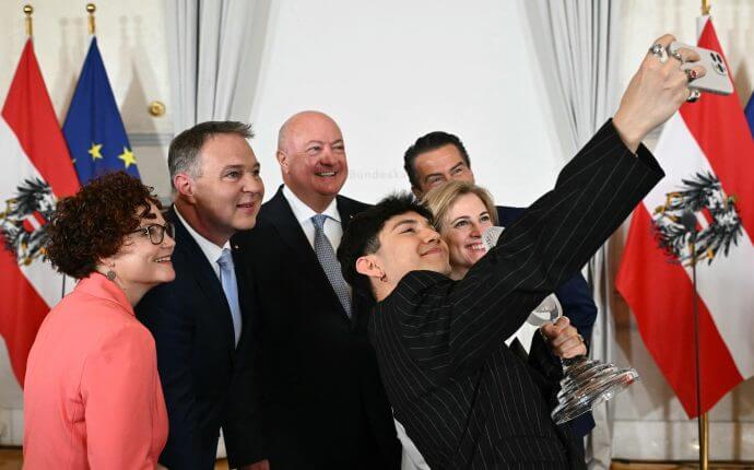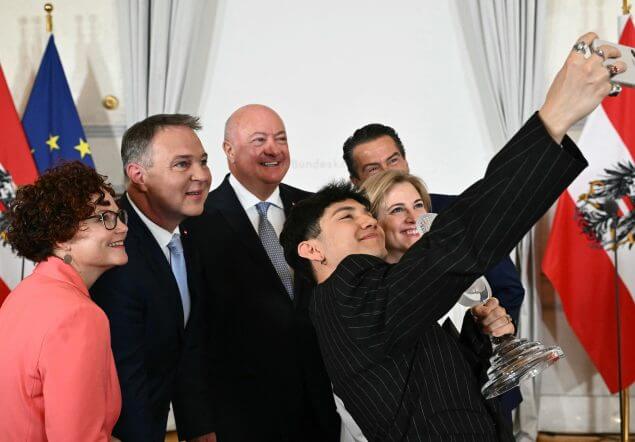 Selfie vor dem Eklat: Kanzler Christian Stocker, Kulturminister Andreas Babler, Staatssekretärin Elisabeth Zehetner, Außenministerin Beate Meinl-Reisinger und ORF-Generaldirektor Roland Weißmann posieren mit ESC-Sieger JJ – kurz bevor dieser mit Israel-Aussagen für Empörung sorgt.APA/AFP/Joe Klamar