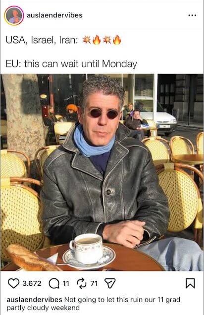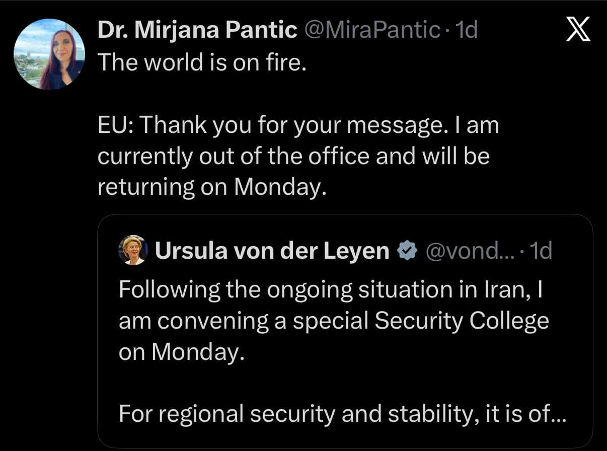 Ein vielfach verbreitetes Meme vergleicht dabei die EU mit einer automatischen Abwesenheitsnotiz: „Danke für Ihre Nachricht. Ich bin derzeit nicht im Büro und kehre am Montag zurück.“ Die satirische Botschaft dahinter: Während andernorts Raketen einschlagen, nehme sich Europa Zeit.