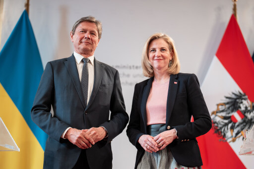 Meinl-Reisinger hatte die Ukraine zu einem ihrer Arbeitsschwerpunkte gemacht. Ihre zweite Auslandsreise im Amt der Außenministerin führte sie nach Kiew, wo sie u.a. Präsident Wolodymyr Selenskyj traf. Und sie machte den damaligen Botschafter in der Ukraine, Arad Benkö, zu ihrem Kabinettschef. Österreich unterstützte die Ukraine bisher mit mehr als rund 300 Millionen Euro an staatlicher finanzieller und humanitärer Hilfeleistung. Jetzt schon gibt es mit dem „Point of Contact” eine nationale Anlaufstelle für den Wiederaufbau des 2022 von Russland angegriffenen Landes.