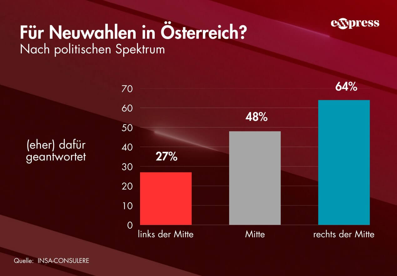 Die Ergebnisse passen ins politische Gesamtbild: Laut Umfrage bleibt die FPÖ mit 37 Prozent klar vorn. Knapp die Hälfte der Österreicher fordert Neuwahlen. Schaut man sich diesen Wunsch nach politischem Spektrum an wird auch eines klar: Wähler rechts der Mitte – 64% – sind eher für Neuwahlen und bei den Mitte-Wählern sind es knapp 50%. Auch die Wähler links der Mitte ´, immerhin knapp 40% sind eher dafür.