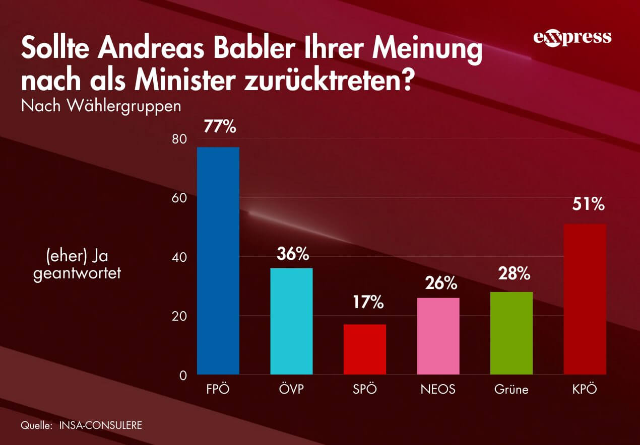 Laut der exklusiven INSA-Umfrage im Auftrag des exxpress fordern 45 Prozent der Befragten Bablers Rücktritt. Nur 22 Prozent wollen, dass er bleibt, ebenso viele ist es egal.