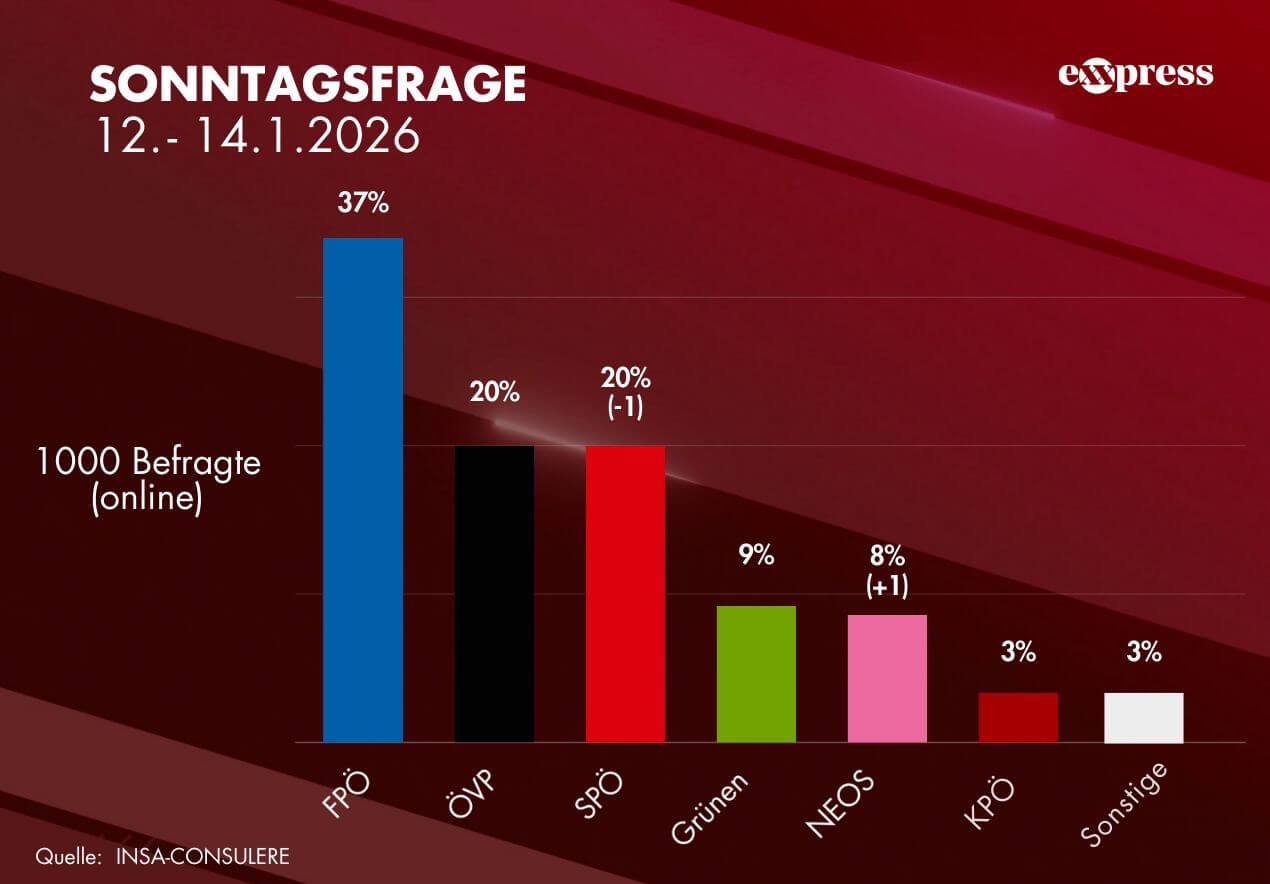 Erhoben wurden die Werte online unter 1000 Befragten im Zeitraum 12. bis 14. Jänner 2026. Die maximale Fehlertoleranz beträgt +/- 3,1 Prozentpunkte.
