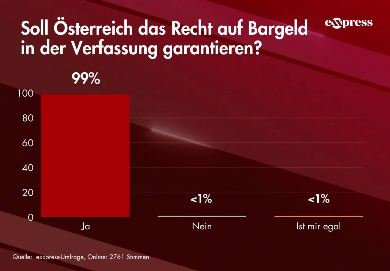 Parallel zum politischen Streit zeigt eine aktuelle exxpress-Umfrage ein eindeutiges Bild: 99 Prozent der 2761 Teilnehmer sprechen sich dafür aus, das Recht auf Bargeld in die österreichische Verfassung aufzunehmen.