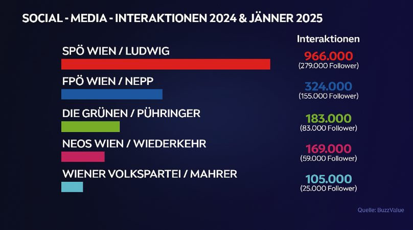 BuzzValue bewertet die Wahlkampf-Auftritte auf Facebook & Co. der Parteien und Spitzenkandidaten vor Wahlen. Jetzt hat sie die Sozialen-Medien-Interaktionen der Wiener Landtagsparteien im Blick auf die Gemeinderatswahlen am 27. April unter die Lupe genommen. Im Jahr 2024, inklusive Jänner 2025, wies die SPÖ Wien mit Spitzenkandidat Michael Ludwig die meisten Interaktionen (966.000) und höchsten Followerzahlen (279.000) auf. Dahinter kommt mit einigem Abstand die FPÖ Wien mit Spitzenkandidat Dominik Nepp (324.000 Interaktionen, 155.000 Follower). Den dritten Platz belegen die Grünen. Schlusslicht mit schwachen Zahlen ist die Wiener Volkspartei. Sie hat nur 105.000 Interaktionen und 25.000 Follower.