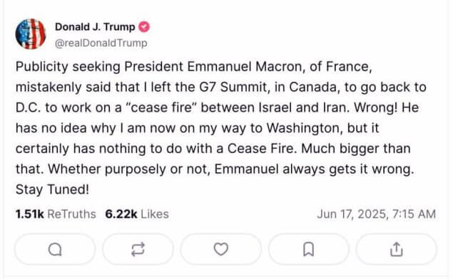 Kurz nach dem Einsteigen in seine Regierungsmaschine Air Force One veröffentlichte Trump einen Social-Media-Post, in dem er Macron mit harten Worten abkanzelte – und klarstellte, dass er nicht nach Washington zurückkehre, um eine Waffenruhe zwischen Israel und dem Iran zu erreichen. Trump zu seiner Rückkehr: „Es hat sicherlich nichts mit einem Waffenstillstand zu tun.“ Und: „Es geht um etwas viel Größeres als das.“ Überdies bezichtigte er Macron, nur Aufmerksamkeit erregen zu wollen.
