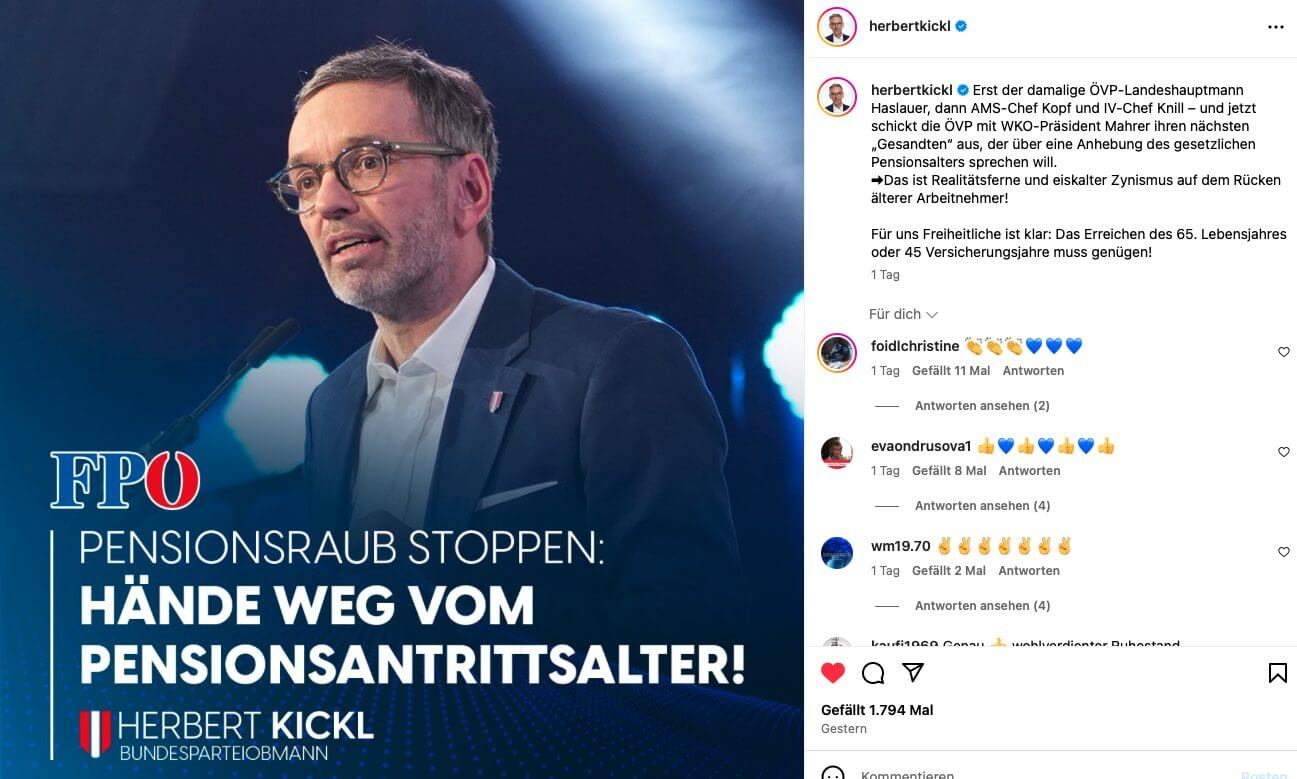 Die FPÖ lehnt eine bloße Angleichung des faktischen an das gesetzliche Pensionsantrittsalter nicht grundsätzlich ab – sie fordert aber, dass diese fair und gerecht abläuft: „Ist es eigentlich gerecht, dass mit 65 jemand in Pension gehen kann, der vielleicht nur 15 Jahre gearbeitet hat, genauso wie jemand, der 47 Jahre gearbeitet hat? Wir finden das nicht gerecht.“