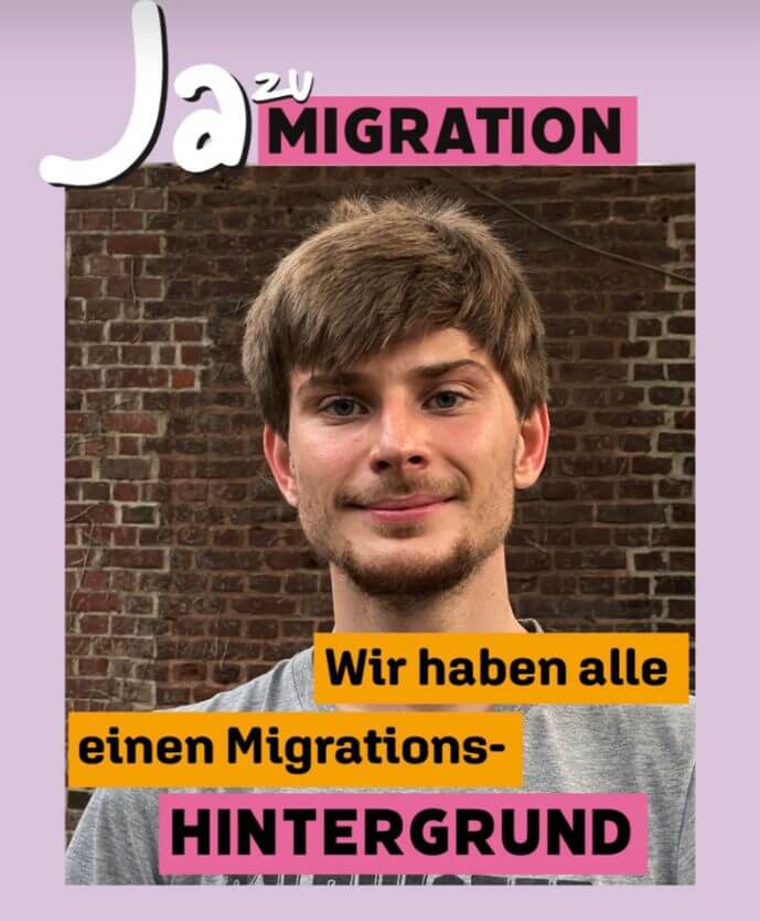 Das nächste zeigt einen jungen, eher deutsch aussehenden Mann. Sein Slogan lautet: „Wir haben alle einen Migrationshintergrund.“ Damit wird vermittelt, dass es Menschen ohne Wurzeln in fremden Ländern eigentlich gar nicht mehr gibt. Deutsche ohne Migrationshintergrund haben nun auch einen Migrationshintergrund – ja, die Welt ist bunt.