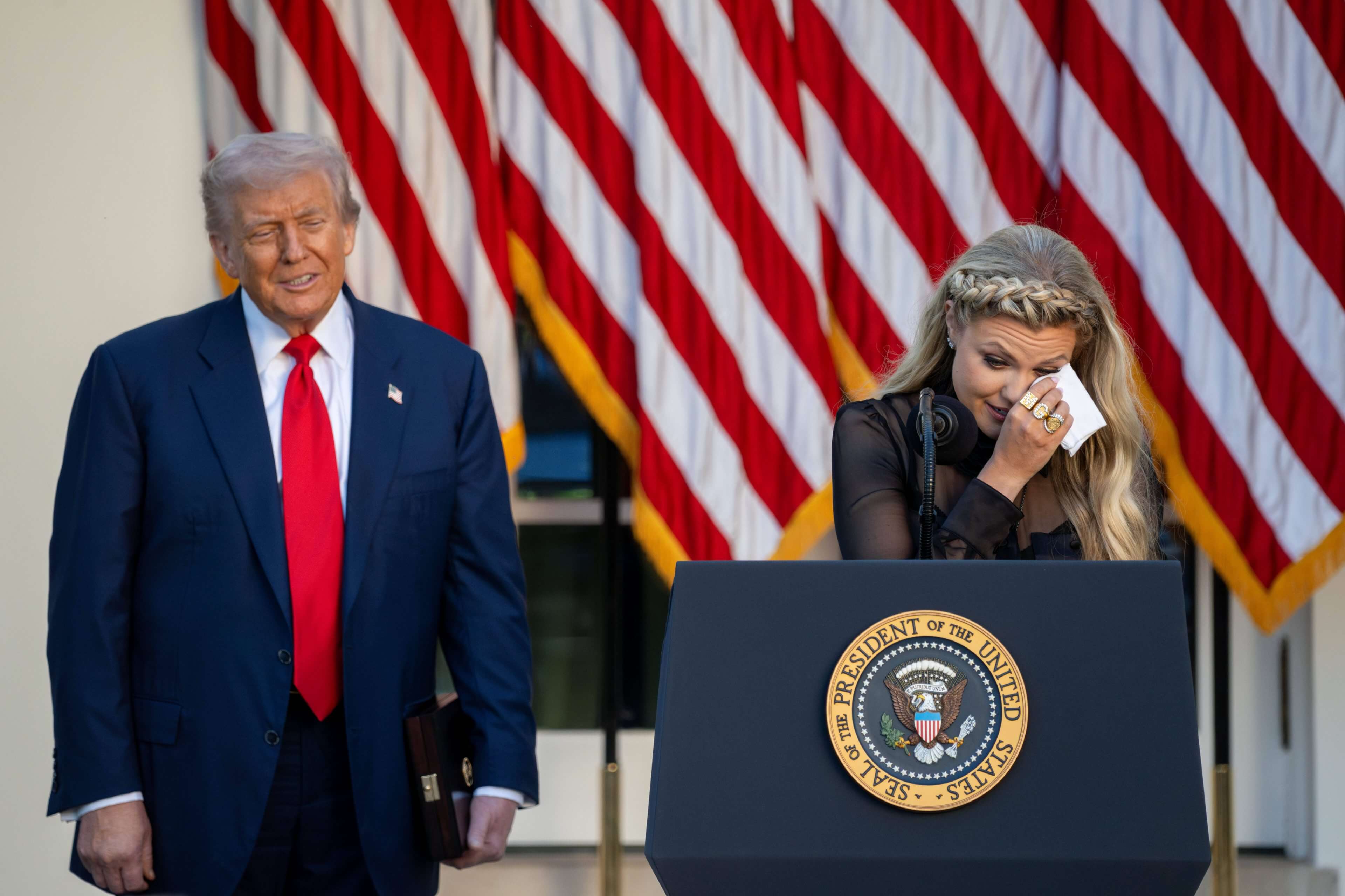 Zu Beginn der Zeremonie zur Verleihung der Freiheitsmedaille bemerkte US-Präsident Donald Trump, das Wetter sollte eigentlich „fürchterlich“ mit Regen werden. Doch „Gott hat aufgepasst“, sagt Trump. Deshalb sei nun Sonnenschein im Rosengarten des Weißen Hauses. „Ich habe Erika gesagt, Gott hat zugesehen und er wollte das nicht für Charlie“, sagte Trump zu Beginn seiner Ansprache. „Das ist wirklich wunderschön. Schöner geht es heute nicht.“