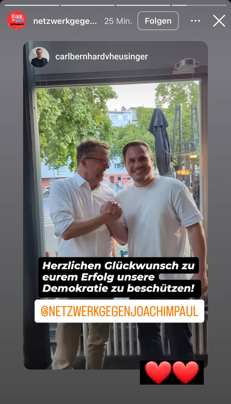 Jutta Steinruck, die 2023 die SPD nicht etwa verlassen hatte, weil sie ihr zu links wurde, sondern weil sie der SPD-Landesregierung fehlende Unterstützung insbesondere im Bildungsbereich vorwarf, lieferte als Vorsitzende des Ausschusses später das gewünschte Ergebnis. Auf der Instagram-Seite des Netzwerks jubelt man. „Wir haben mit dem Netzwerk Joachim Paul als OB-Kandidat verhindert!“ Dazu wurden Glückwünsche des Grünen-Landtagsabgeordneten Carl-Bernhard von Heusinger geteilt, die sich an den Wahlausschuss richteten. Ein linkes Netzwerk aus NGO-Aktivisten und Politikern forcierte also ganz bewusst den Ausschluss des AfD-Politikers.